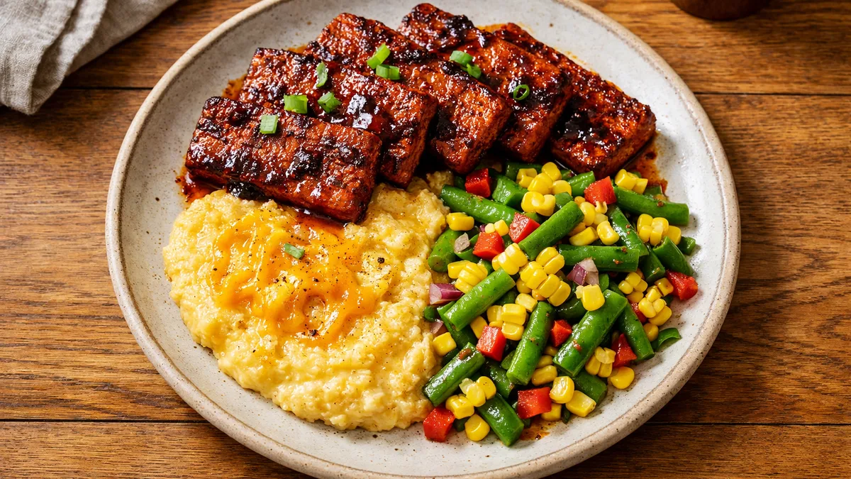 with Cheesy Polenta and Green Bean-Corn Hash
