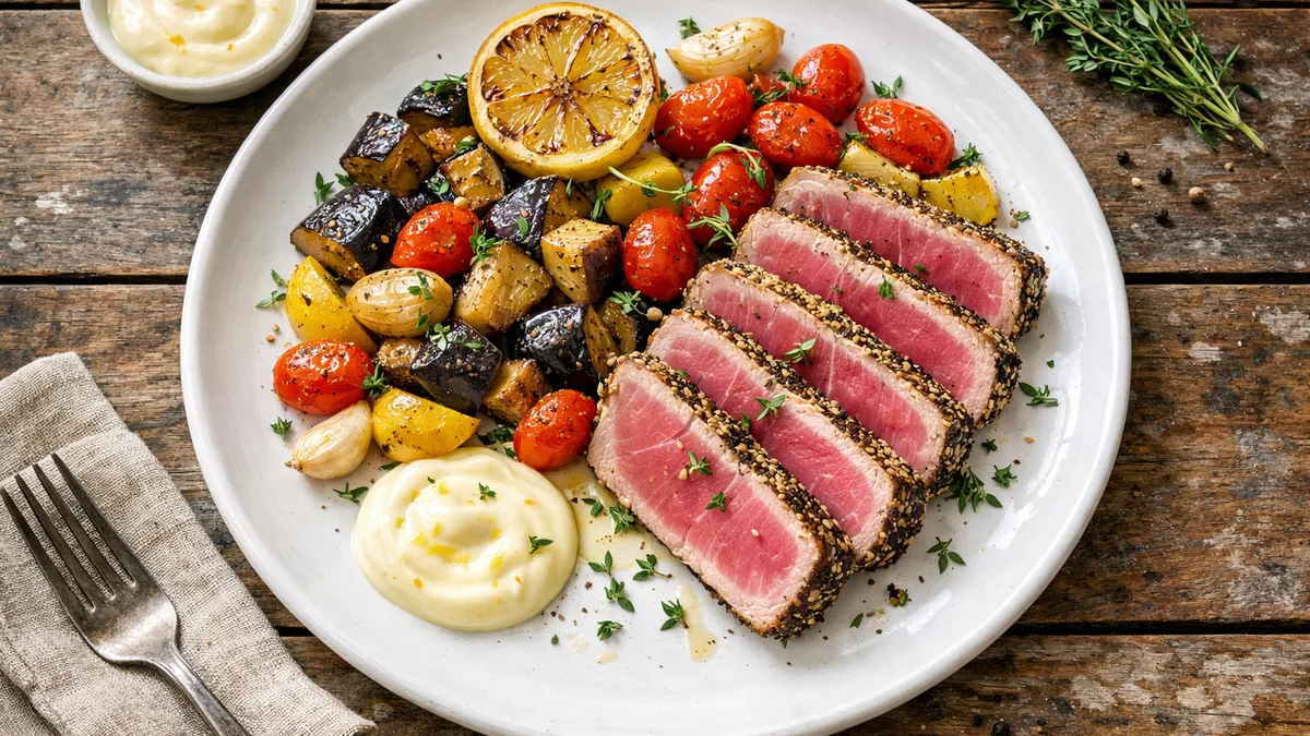 with Thyme-Roasted Summer Veggies and Lemon Aioli