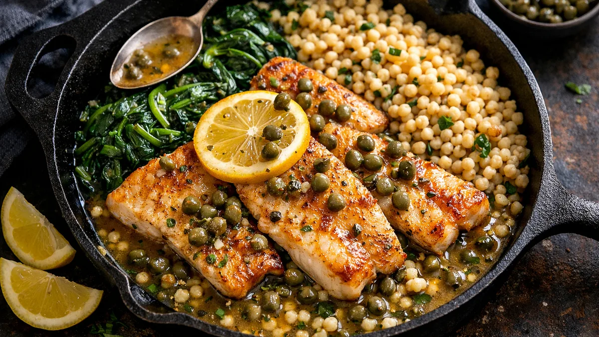 with Sautéed Spinach, Israeli Couscous, and Lemon Caper Sauce